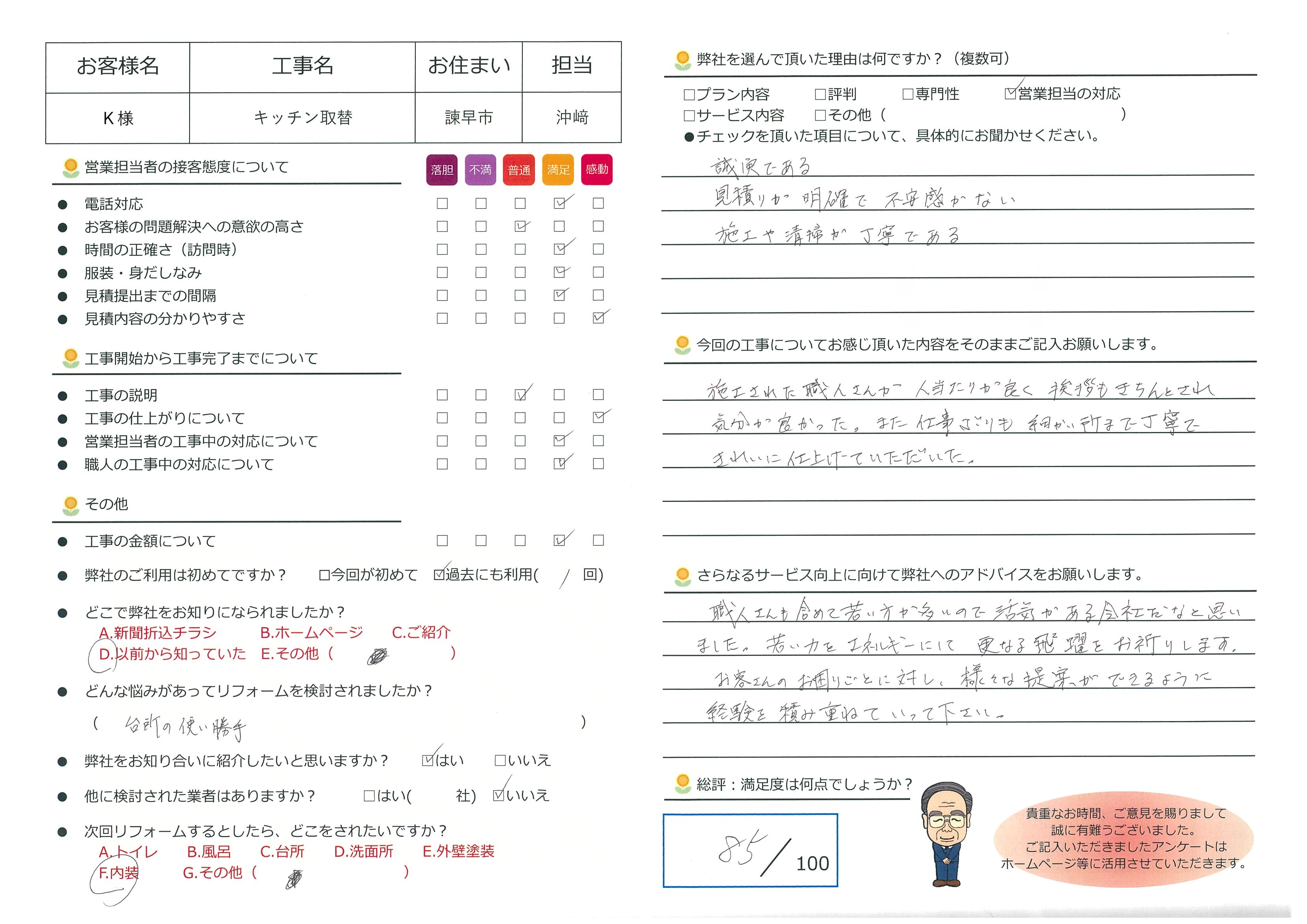 この度は諫早市でのキッチンリフォームをお任せいただき、誠にありがとうございました。お客様より「誠実で、見積もりが明確で安心できた」とのお声をいただき、大変嬉しく拝見いたしました。リフォームは金額や工事内容に不安を感じやすい部分でもありますので、事前のご説明やお見積もりにご納得いただけたことを安心しております。また、施工や清掃の丁寧さ、職人の礼儀や人柄にまで温かい評価をいただけたことは、日頃から大切にしている点ですので、私たちの励みになります。若いスタッフや職人が多いことで、会社全体に活気があると感じていただけたことも光栄です。今後はさらに経験を積み重ね、お客様のお困りごとにより的確なご提案ができるよう努めてまいります。引き続きご愛顧いただけますと幸いです。