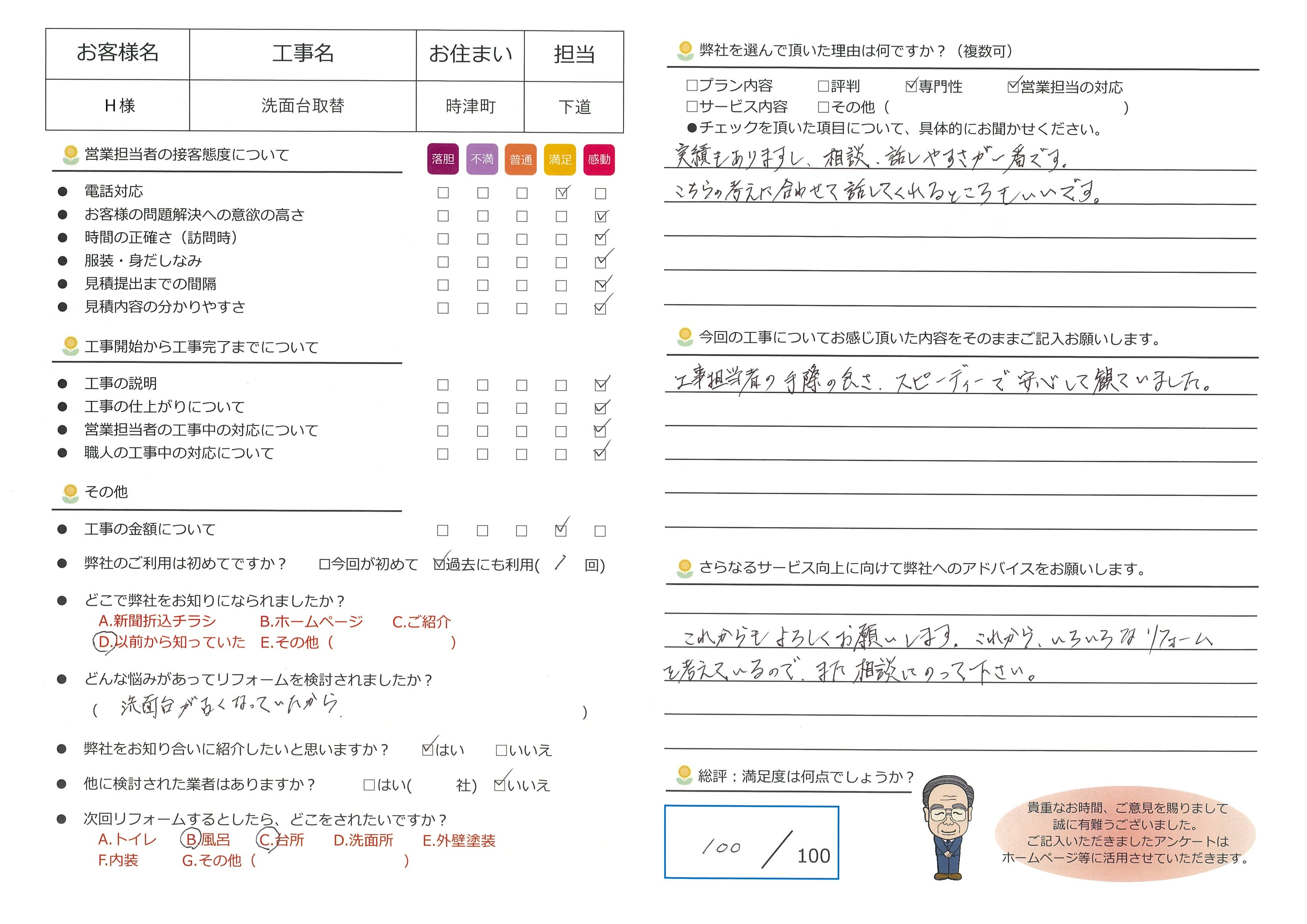 この度は時津町での洗面台リフォームおよび浴室水栓取替をご依頼いただき、誠にありがとうございました。数ある業者の中から、これまでの実績や「相談しやすさ」を評価いただき、再びお任せいただけたことを大変嬉しく思っております。お客様のお考えに寄り添いながらご提案・お打合せを進めることを心掛けておりますので、「こちらの考えに合わせて話してくれるところが良い」とのお言葉は、私にとっても大変励みになります。また、工事担当者の手際の良さやスピーディーな作業を安心してご覧いただけたとのご感想を頂戴し、施工に携わったスタッフも喜んでおります。これからも「頼んでよかった」と思っていただける対応を続けてまいります。今後、他のリフォームもご検討とのこと、ぜひお気軽にご相談ください。精一杯お手伝いさせていただきます。
