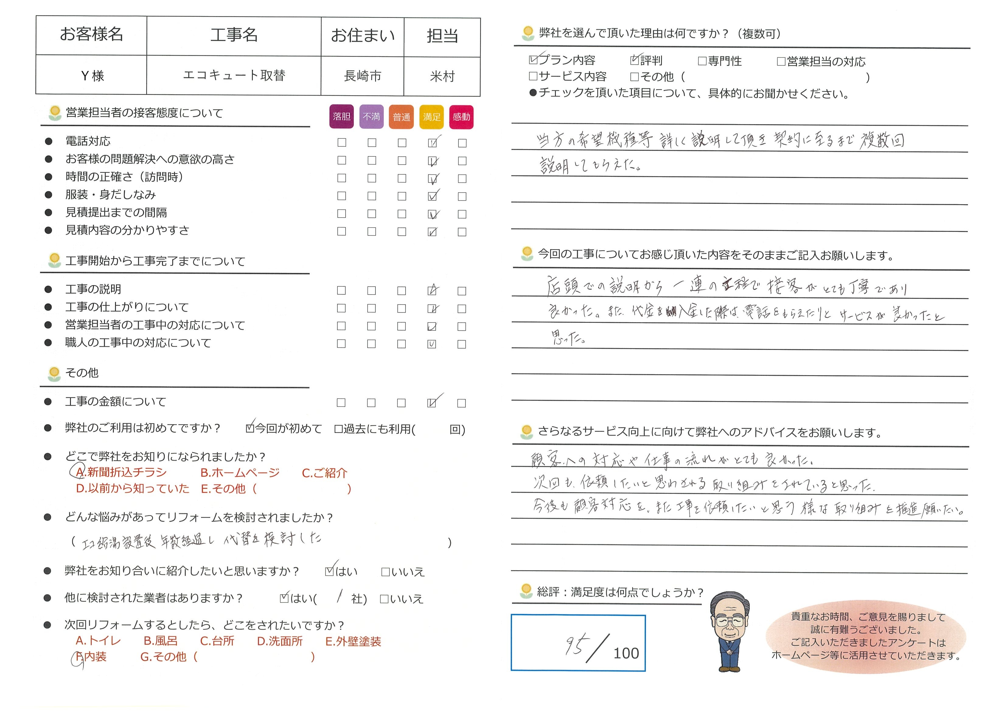 この度は長崎市にてエコキュート取替工事をご依頼いただき、誠にありがとうございました。数ある業者の中から当社をお選びいただき、さらにご契約に至るまで複数回にわたりご説明の機会をいただけましたこと、心より感謝申し上げます。お客様にご納得いただけるよう、機種の特徴や工事の流れを一つひとつ丁寧にご案内することを常に心掛けておりますので、「説明が詳しく丁寧で良かった」とのお言葉を頂戴でき、大変嬉しく思います。また、ご入金の際のご連絡や接客対応についてもご評価いただき、スタッフ一同励みになっております。今後も「次回もお願いしたい」と思っていただけるよう、顧客対応・施工品質の両面で一層の向上に努めてまいります。これからも末永いお付き合いをどうぞよろしくお願いいたします。