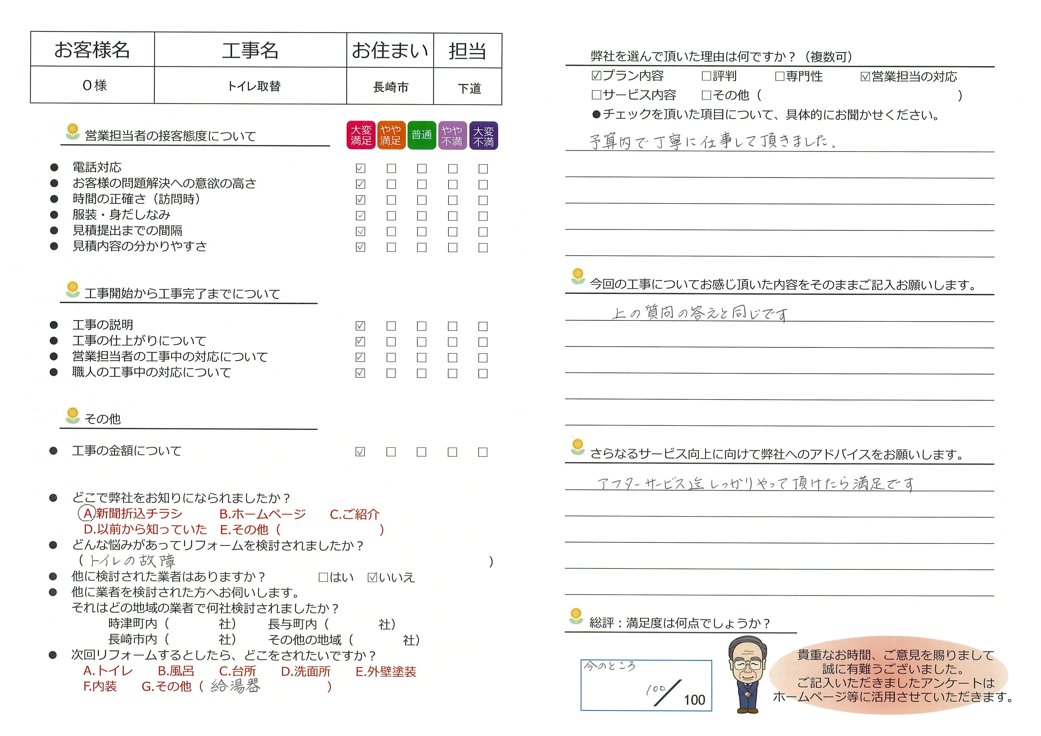 この度は、長崎市にてトイレリフォーム工事をご依頼いただき誠にありがとうございました。お客様より「予算内で丁寧に仕事して頂きました。アフターサービス迄しっかりやって頂けたら満足です。」との温かいお言葉をいただき、大変嬉しく拝読いたしました。今回の工事では、ご予算の中で最大限ご満足いただけるよう、商品の選定から施工内容のご提案まで丁寧に進めさせていただきました。仕上がりにご安心いただけたことが、私どもにとって何よりの励みです。アフターサービスについてもご期待に沿えるよう、今後の点検や万一の不具合への迅速な対応を徹底し、長く快適にお使いいただけるようしっかりサポートしてまいります。これからも「お願いして良かった」と思っていただけるよう、誠意をもって対応させていただきますので、末永いお付き合いをどうぞよろしくお願いいたします。