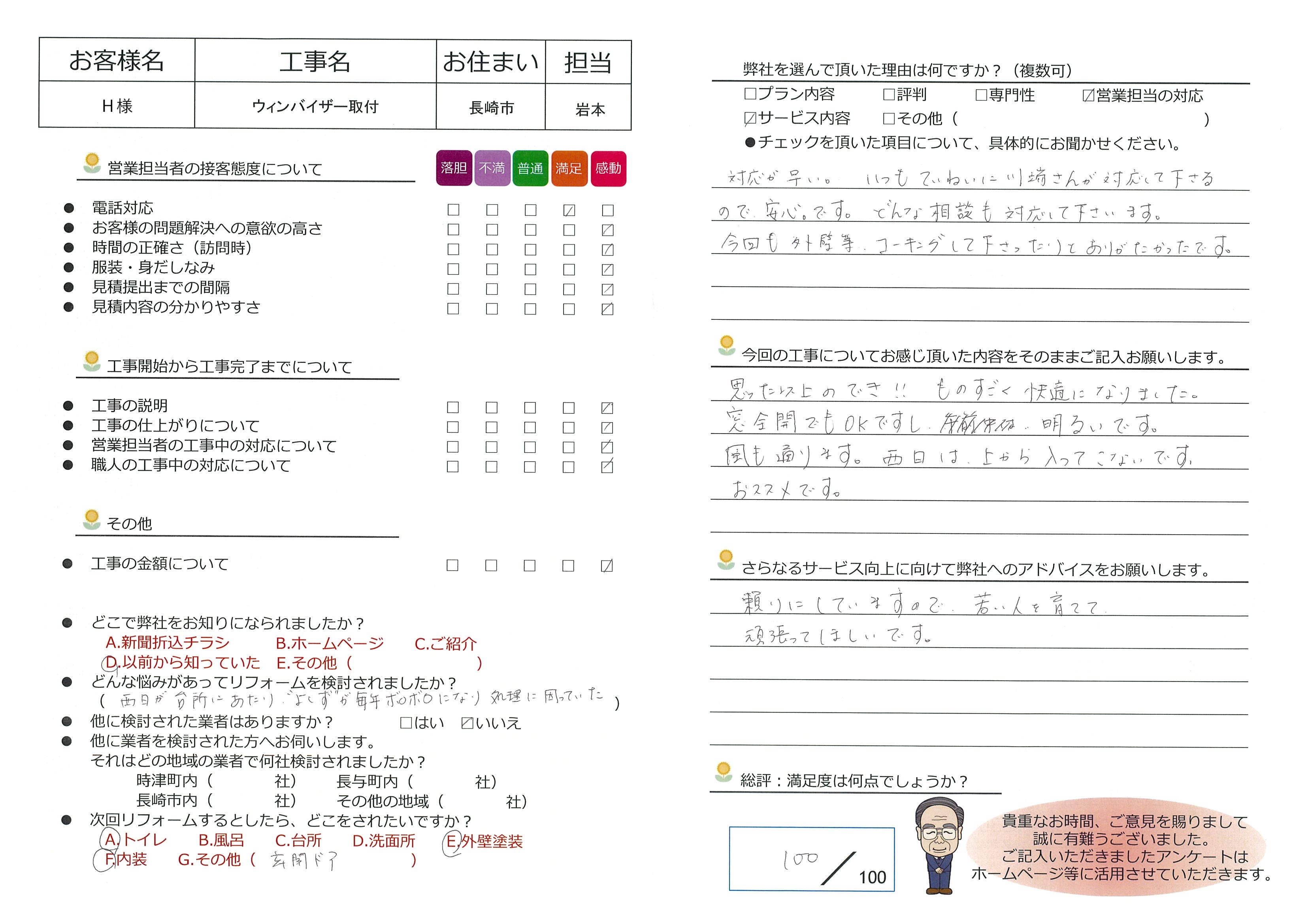 川端と一緒に担当させて頂きました岩本です。この度は、長崎市にてウィンバイザー取付工事のご依頼をいただき、誠にありがとうございました。さらにアンケートにて温かいお言葉を頂戴し、大変嬉しく拝見いたしました。日頃より川端の対応を「安心できる」「どんな相談にも対応してくれる」と信頼いただけていることは、担当者として何よりの励みです。今回はウィンバイザーの設置に加え、外壁のコーキング補修なども合わせて対応させていただきましたが、「思った以上のでき」「ものすごく快適になった」とのお声をいただき、工事の成果がしっかりと実感いただけたことを心から嬉しく思っております。窓を開けても明るさや風通しがあり、西日も防げることで、より快適な住環境をお届けできたと感じております。また「若い人を育てて頑張ってほしい」との励ましのお言葉もありがとうございます。今後も次の世代に技術や心配りをしっかり伝え、より良いサービスをお届けできるよう努めてまいります。改めまして、この度のご依頼とご信頼に心より感謝申し上げます。
