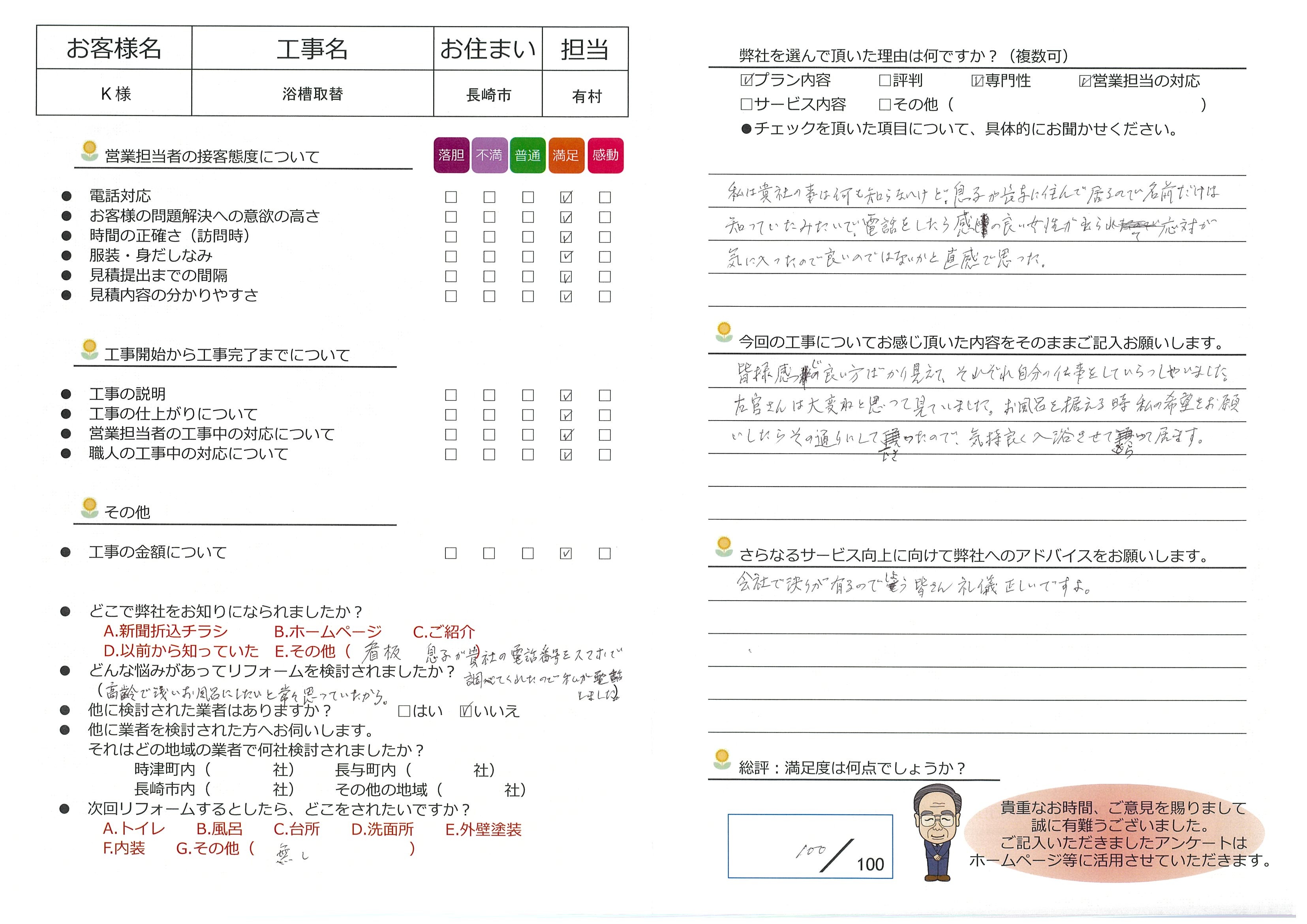 私は貴社の事は何も知らないけど、息子が長与に住んで居るので名前だけは知っていたみたいで、電話をしたら感じの良い女性が出られて応対が気に入ったので良いではないかと直感で思った。
