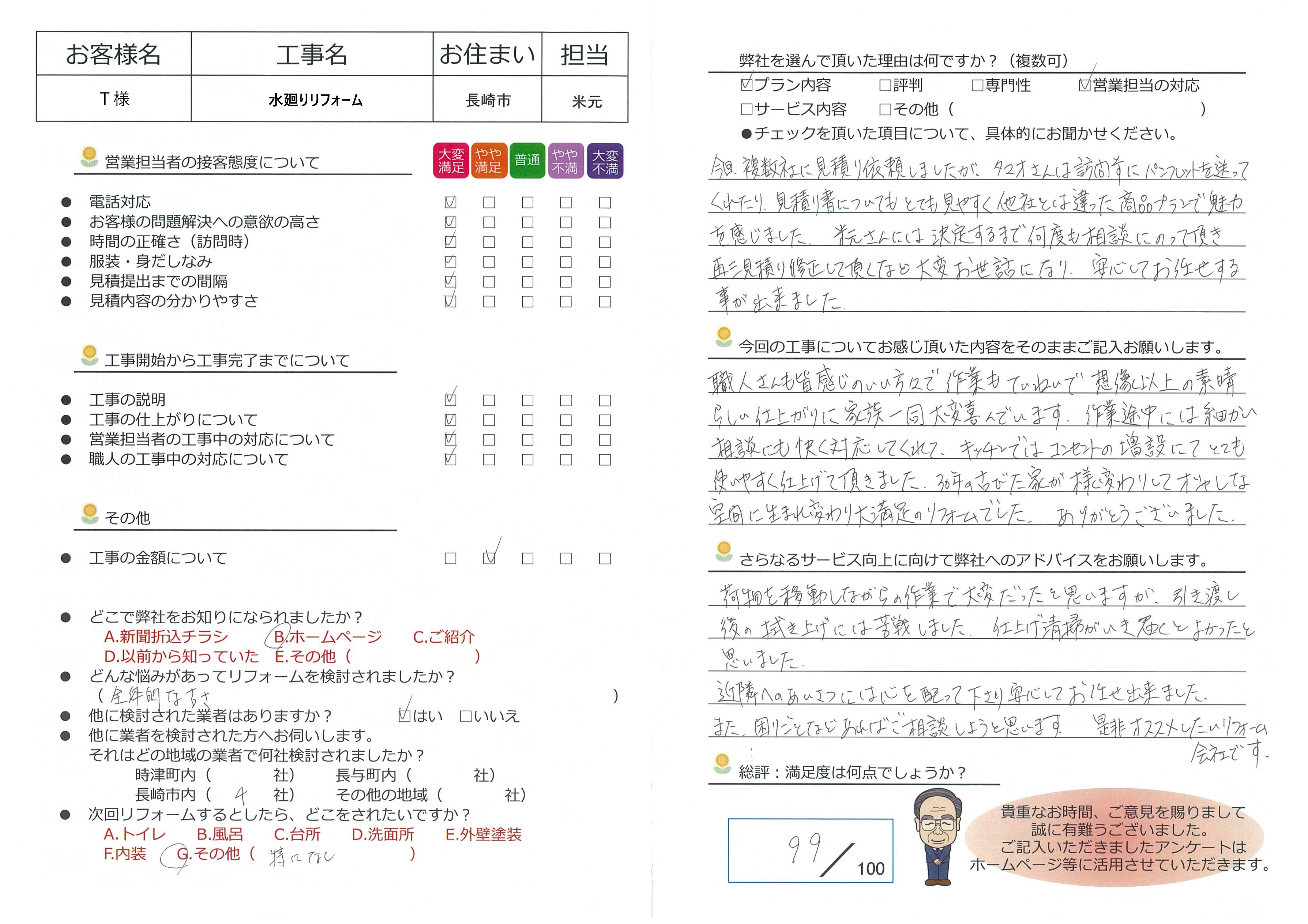 このたびは、水廻りリフォームのご依頼を誠にありがとうございました。複数社のお見積りの中から、弊社のプランや対応を評価いただきお選びいただけたこと、大変光栄に思います。お打ち合わせでは何度もご相談を重ねる中で、ご希望をひとつひとつ整理しながら最適なプランを一緒に形にしていけたこと、私自身も非常にうれしく感じております。職人たちへのお褒めの言葉も励みになります。現場では細かなご要望にも柔軟に対応し、安心してお任せいただけるよう努めてまいりました。キッチンのコンセント増設など、日々の使い勝手にもご満足いただけたようで何よりです。仕上げ掃除に関して貴重なご意見もありがとうございます。今後のサービス向上にしっかりと活かしてまいります。これからもお住まいのことでお困りの際は、どうぞお気軽にご相談ください。末永く快適にお過ごしいただけますよう、引き続きサポートさせていただきます。