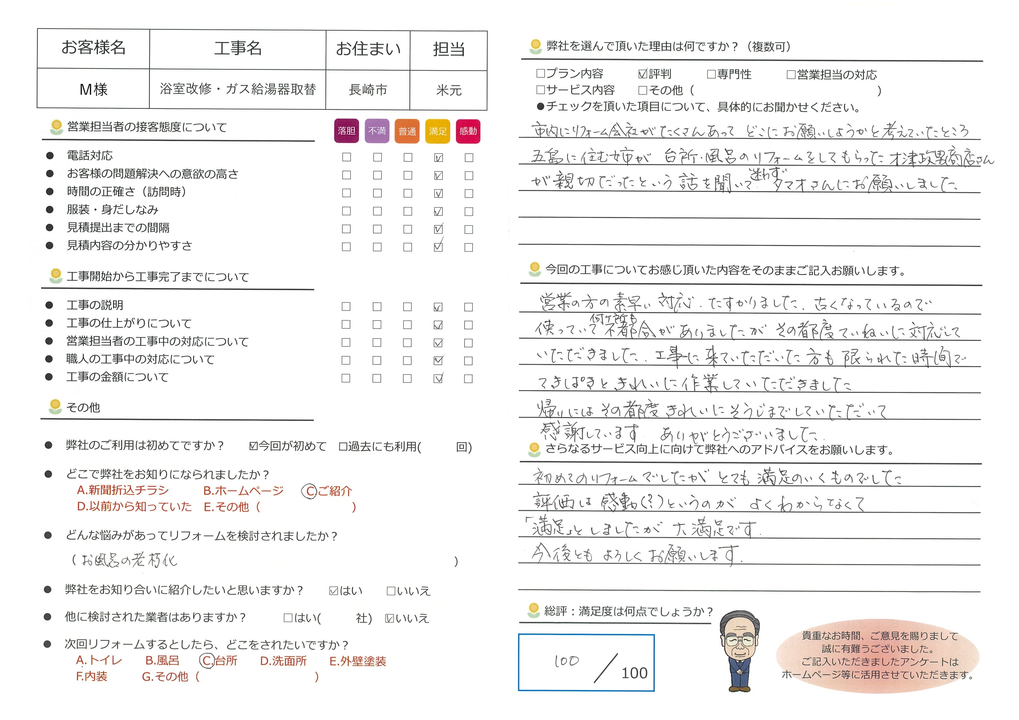 この度は浴室リフォームとガス給湯器取替工事をご依頼いただき、誠にありがとうございました。また、五島にお住まいのお姉さまからのご紹介というご縁でタマオをお選びいただけたこと、大変嬉しく思っております。初めてのリフォームということでご不安も多かったかと思いますが、「素早い対応で助かった」「不具合にもその都度ていねいに対応してくれた」とのお言葉を頂きスタッフ一同、大変励みになっております。工事に伺った職人への温かいお言葉や、清掃まで含めてご満足いただけたことも本当にありがたく拝見しました。評価についても「大満足」とおっしゃっていただき、心から感謝申し上げます。これからも安心してお任せいただけるよう、より良いサービスづくりに努めてまいります。お住まいのことで気になる点がございましたら、いつでもお気軽にご相談ください。今後ともどうぞよろしくお願いいたします。