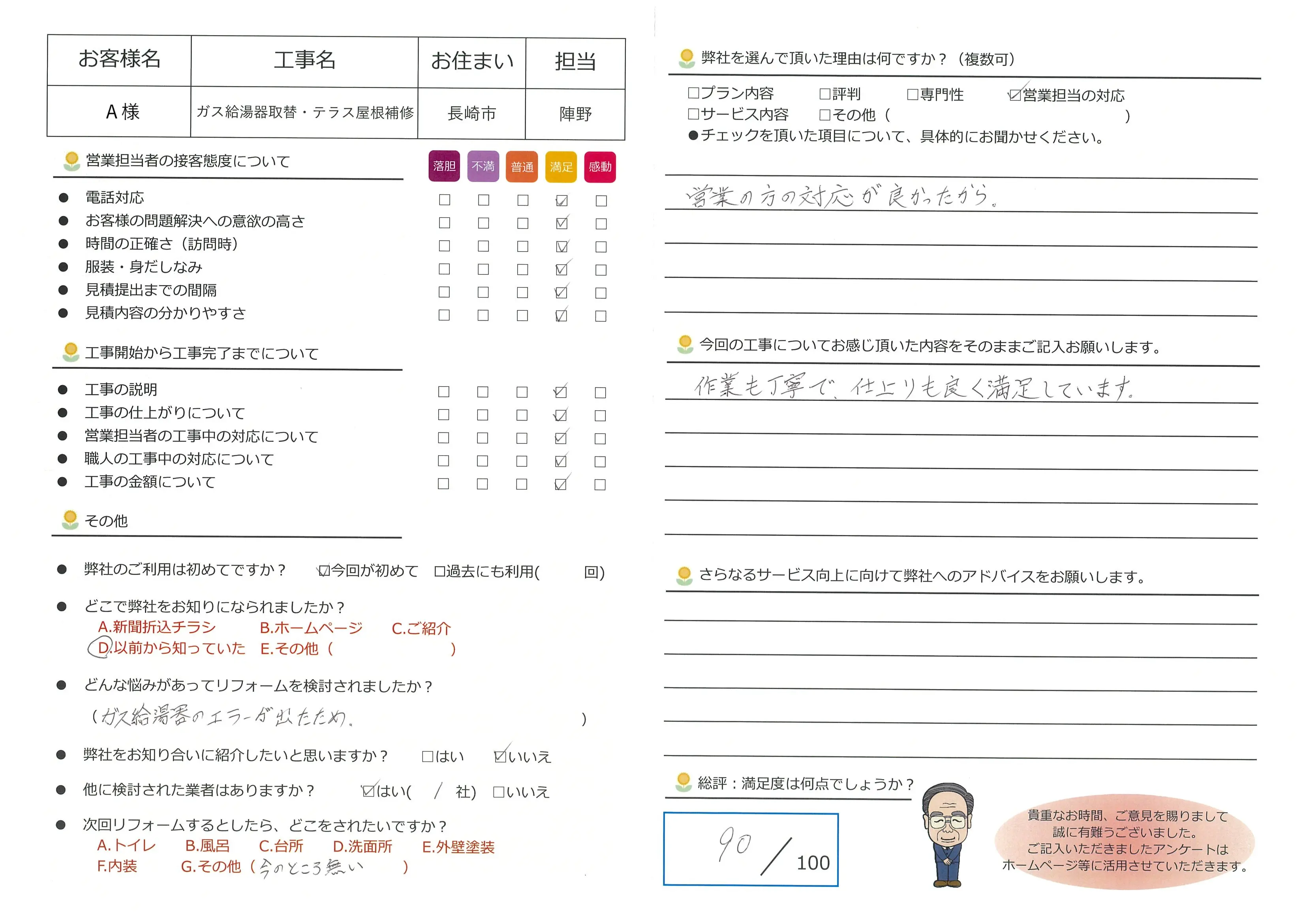 この度はガス給湯器の取替とテラス屋根補修をご依頼いただき、誠にありがとうございました。また、数ある会社の中から当社をお選びいただき、「営業担当の対応が良かった」とのお言葉を頂戴し、大変うれしく思っております。工事についても「作業が丁寧で仕上がりも良い」とご満足いただけたとのことで、担当・施工スタッフ一同とても励みになります。給湯器は毎日使う設備ですので、安心してお使いいただける環境を整えるお手伝いができたことを嬉しく思います。テラス屋根についても、これからの生活が少しでも快適になれば幸いです。今後も何か気になる点やお困りごとがございましたら、どうぞお気軽にお声かけください。引き続き、お住まいのサポートができれば嬉しく思います。この度はアンケートへのご協力、誠にありがとうございました。