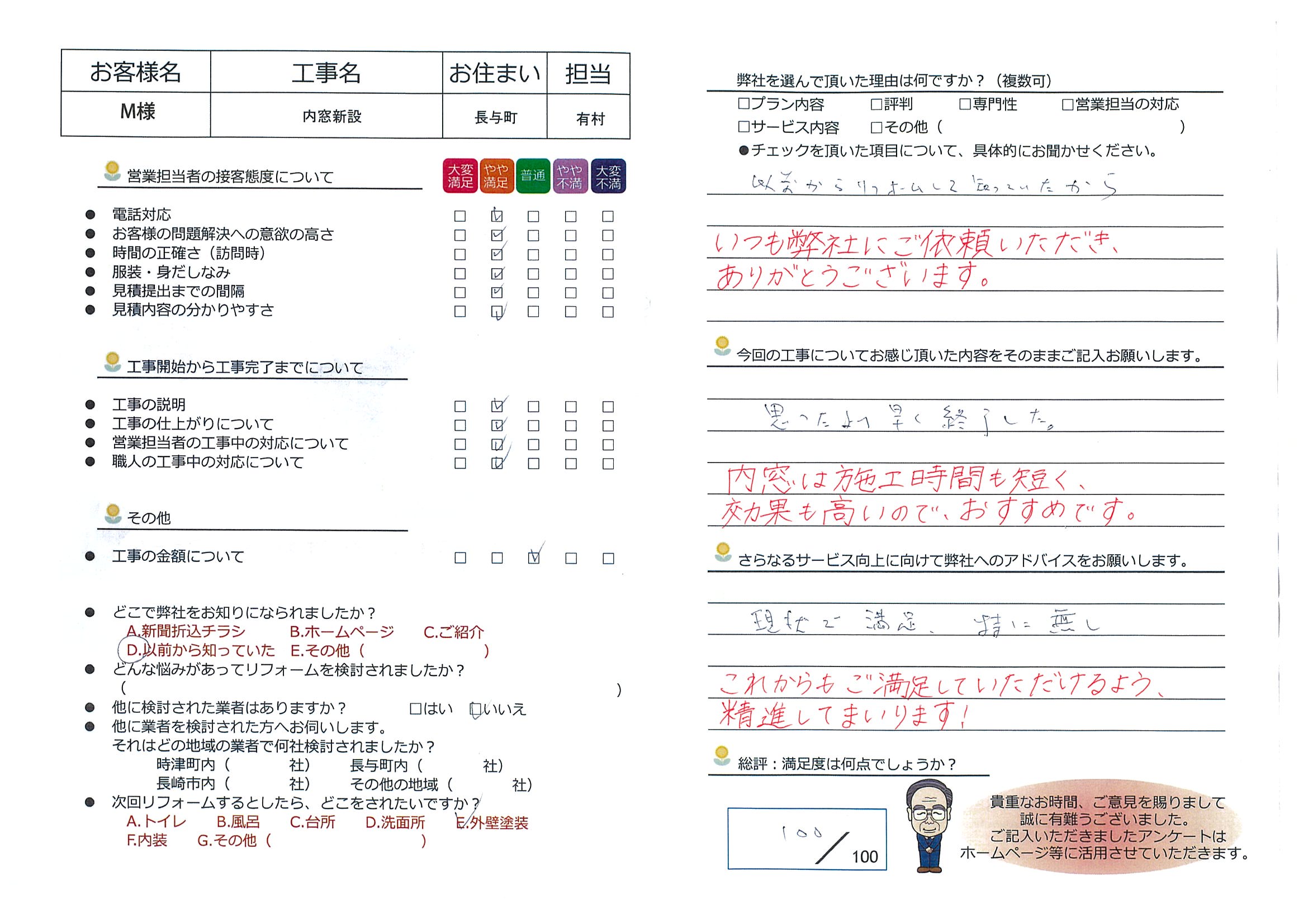今回の工事についてお感じ頂いた内容をそのままご記入お願いします。