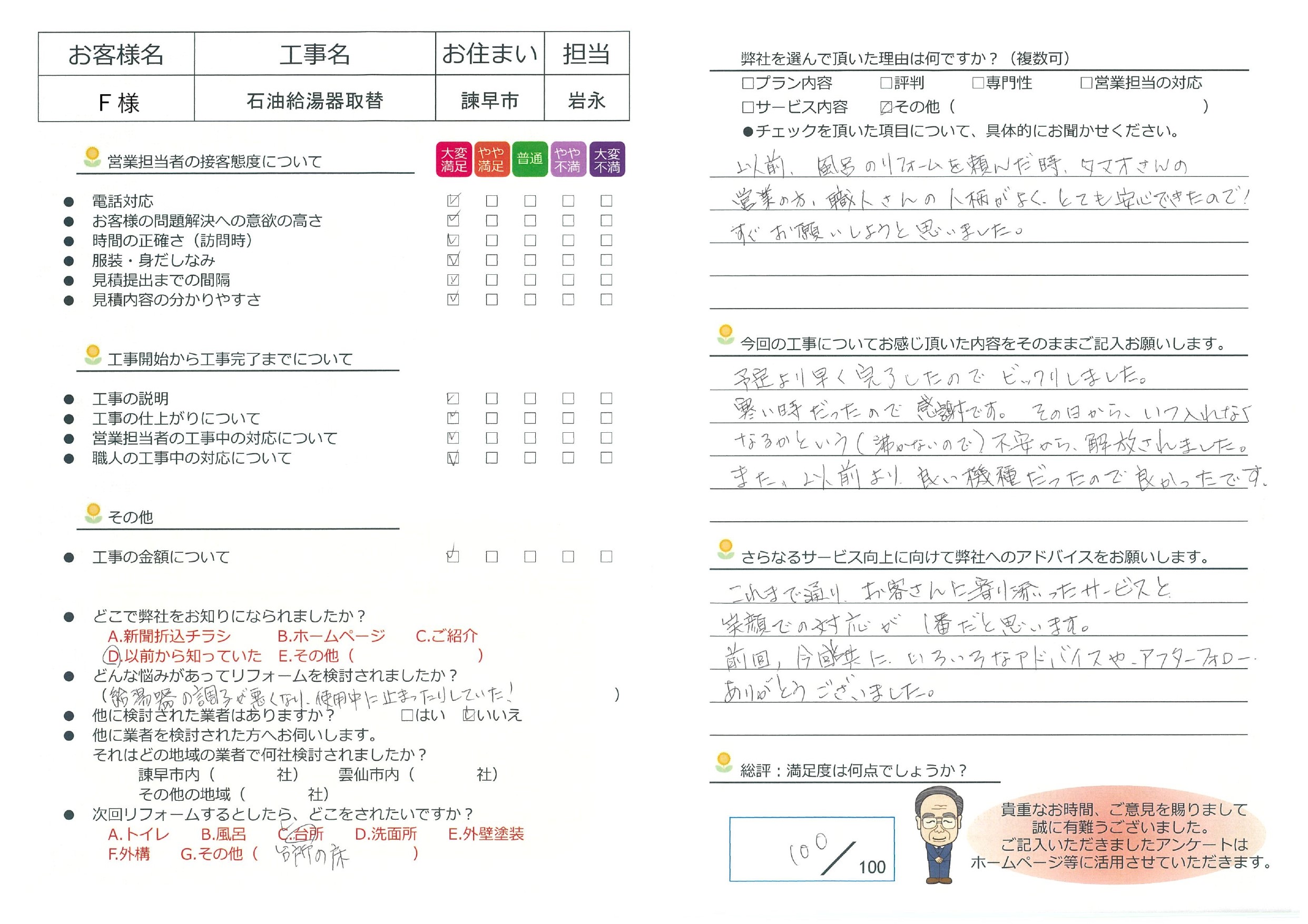 予定より早く完了したのでビックリしました。寒い時だったので感謝です。その日から、いつ入れなく